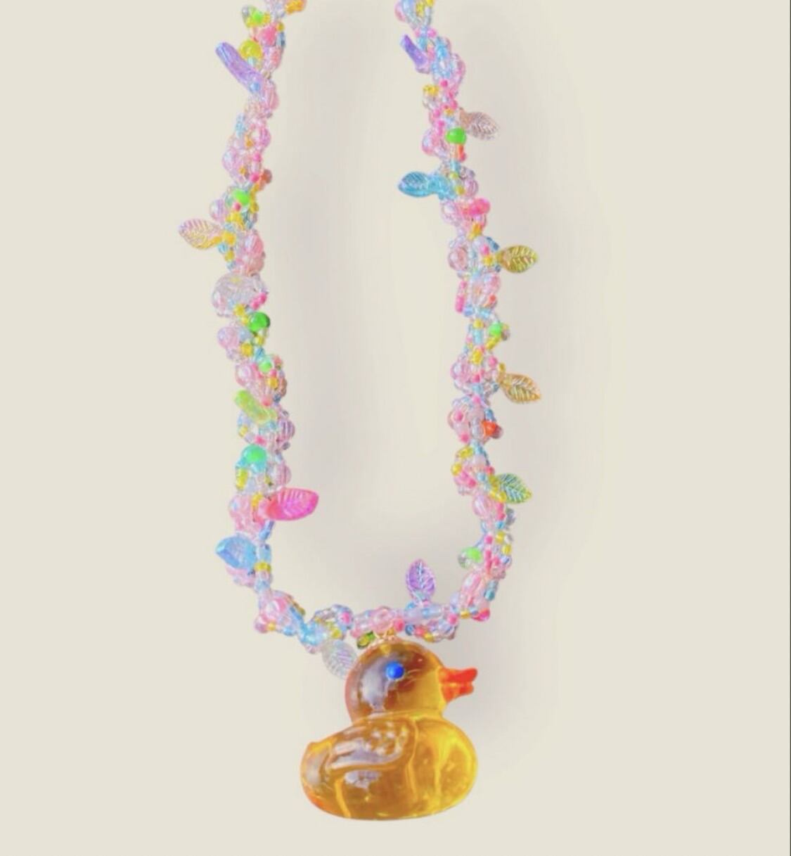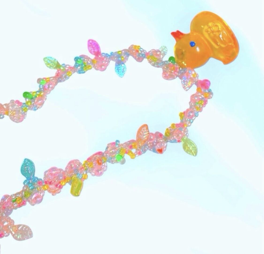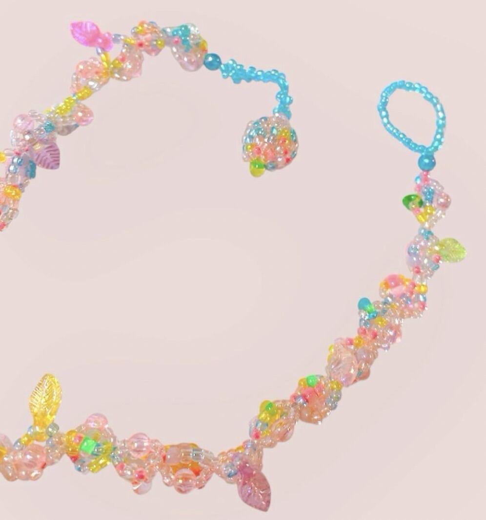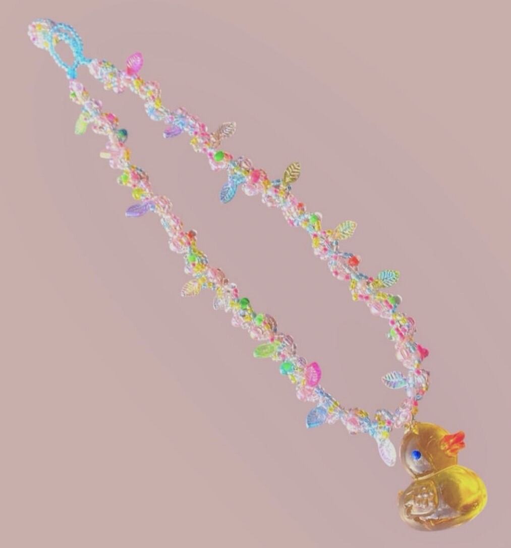 透明感のあるビーズとカラフルな小さな葉を編み込んだ、幻想的なネックレスです。